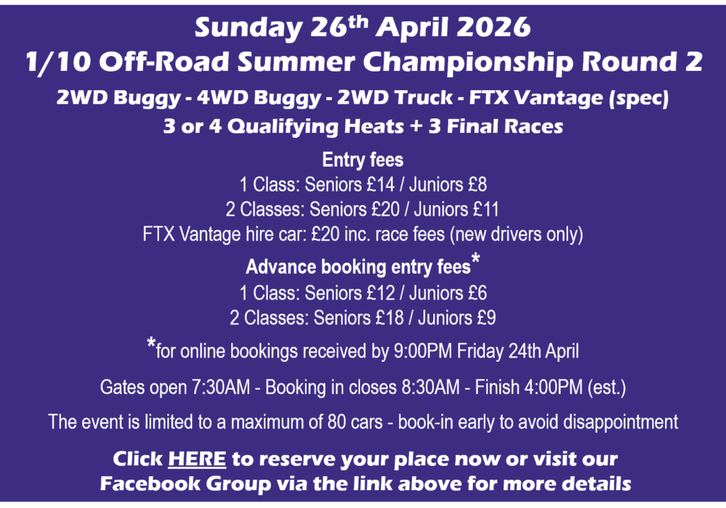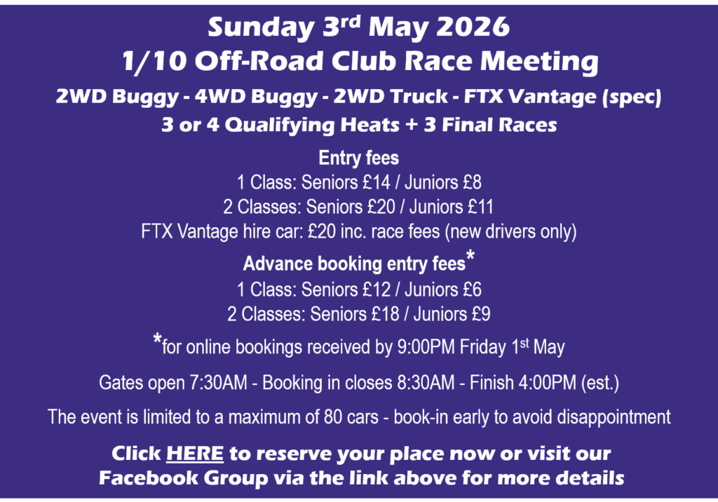 If you’ve never raced before and would like to give it a try, the club has a brushless FTX Vantage 4WD buggy that can be hired for £20 per day (inclusive of race entry fees). Full details are available here.